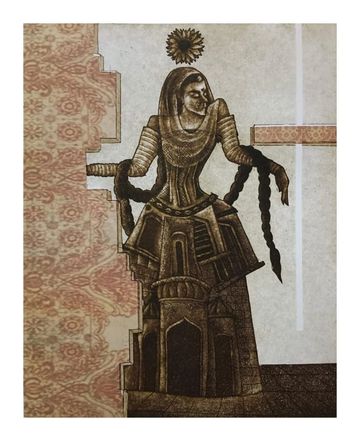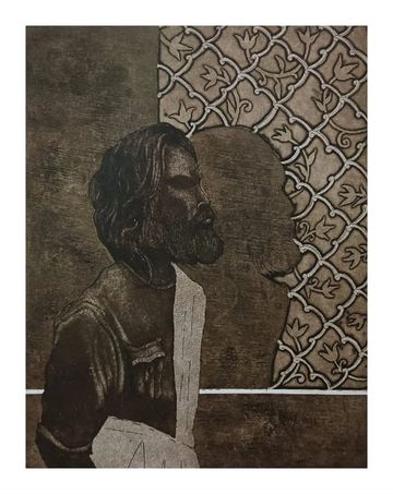 Inspired by Jaipur, this etching merges fashion illustration with Rajasthani architectural motifs. A stylized self-portrait wears imagined architectural attire, blending tradition and structure. Through this visual fusion, the artist reflects on place, cultural memory, and the exploration of identity, particularly queer identity, as a deeply personal and expressive journey.