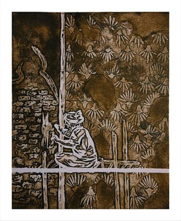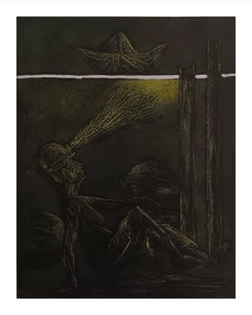 This etching draws from the artist’s childhood in Jharia, a coal-mining town. A paper boat drifting above suggests innocence and imagination, while below a coal worker toils in darkness. The contrast reveals layered memories, survival, and the unseen realities beneath everyday life.